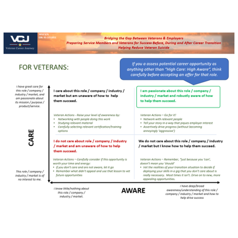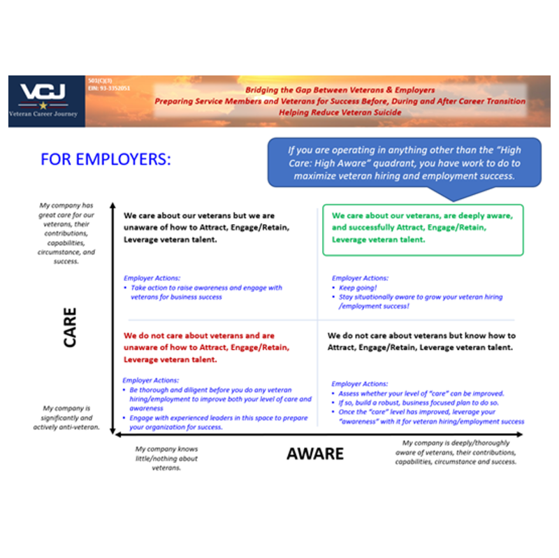 Several years ago I created what I call the “Care/Aware Matrix”. That original version focused on employer readiness for veteran hiring and employment, offering a model to assess where they stand.