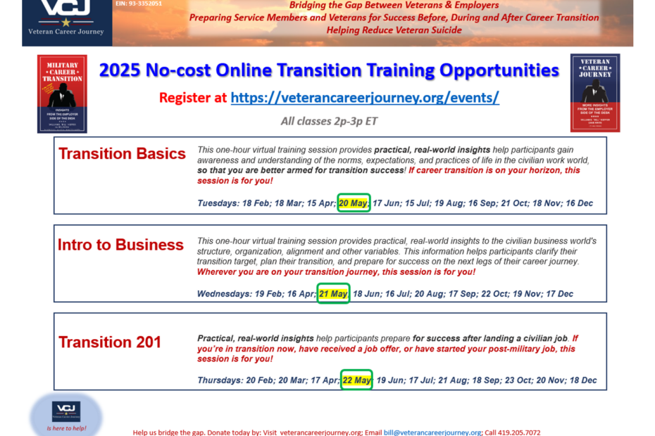 VCJ’s no cost, no-nonsense, online career transition training sessions this month are: Transition Basics – Tuesday 20 May intro to Business – Wednesday 21 May…