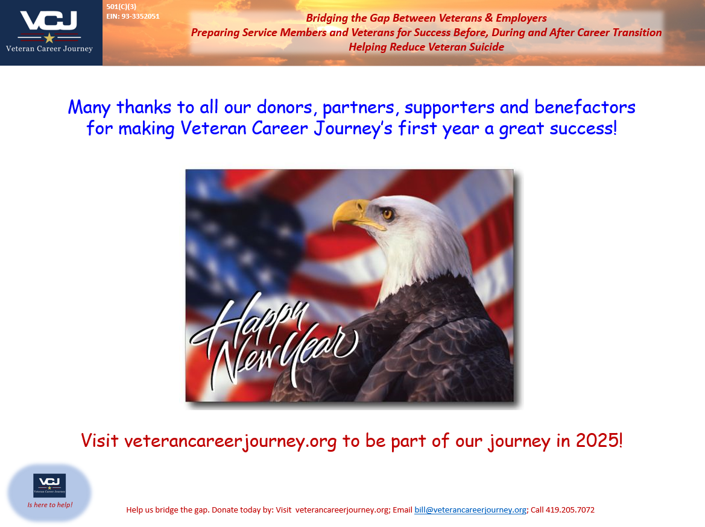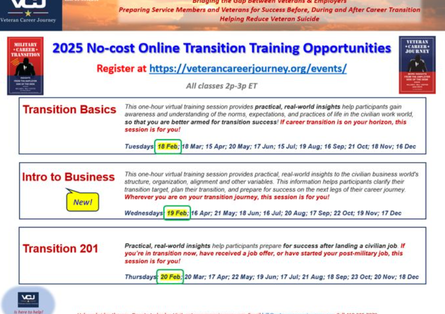 Veteran Career Journey (VCJ) is excited to announce the addition of a third no-cost, online training course: “Intro to Business.” This one-hour virtual session is…
